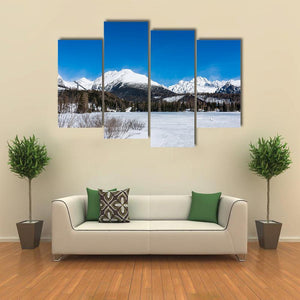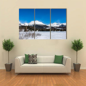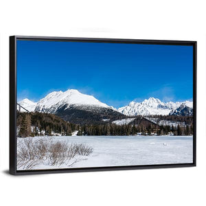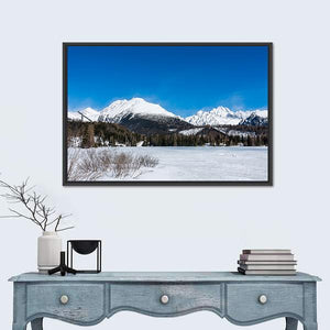 View of Frozen Lake With Mountains is a photorealistic landscape showing a frozen lake framed by snow-capped mountains and evergreen trees. Rendered in cool blues, whites and greens with clear depth and a rule-of-thirds composition, it creates a serene, cold, majestic mood that suits modern home decor and works as a calm focal point in living spaces.