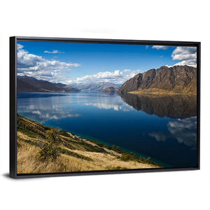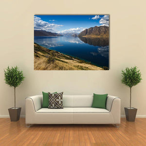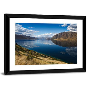 A realistic landscape of Lake Hawea featuring mountains, sky, clouds and their reflection in calm water. The blue, green, brown and white palette creates a serene, majestic, peaceful mood that suits modern homes and quiet living spaces like living rooms or bedrooms.