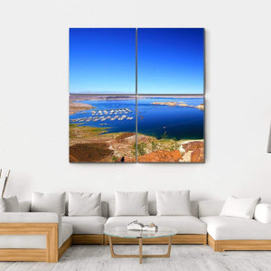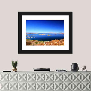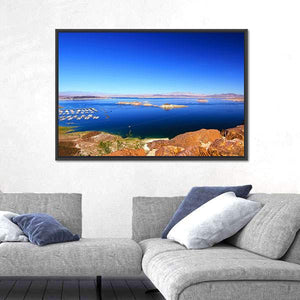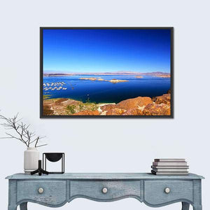 Experience the serene beauty of Lake Mead with this vibrant canvas wall art. Featuring a high-angle view of the lake, boats gently docked at the marina, and islands scattered across the water, it brings a sense of vastness and tranquility to any space.