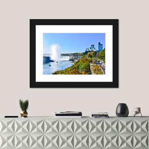 This canvas print shows a wide, realistic view of Niagara Falls in autumn, featuring boats on the water and rich fall foliage. The blue, green, brown, and white palette and majestic, vibrant mood work well in modern living rooms, entryways, or nature-themed spaces.