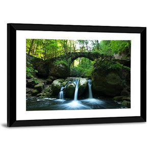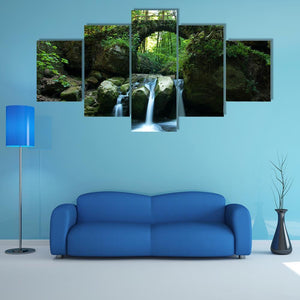 This canvas artwork showcases a serene scene featuring a moss-covered stone bridge and a cascading waterfall nestled in a lush forest. The tranquil palette of greens, browns, and soft blues evokes a natural, rustic vibe that complements various decor styles.