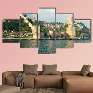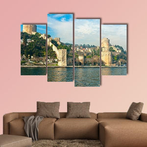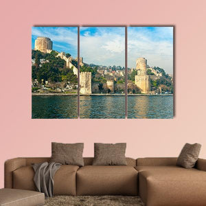 View of Rumeli Fortress in Istanbul shows the stone fortress atop a hill beside a calm body of water, with trees and a clear daytime sky. The realistic landscape, composed with rule-of-thirds balance, uses blues, greens, tans and white to convey a historic, grand and serene mood. It suits travel-themed rooms, living areas, or home offices as a quiet focal piece.