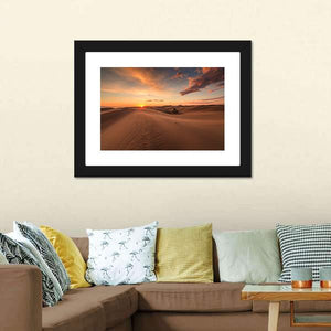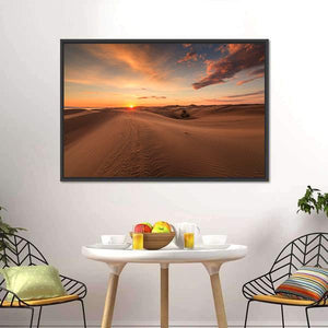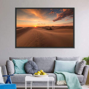 This canvas wall art features striking desert dunes beneath a stunning sunset. The warm palette of orange, yellow, and brown evokes a serene and vast atmosphere, adding a touch of nature's beauty to your space.