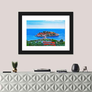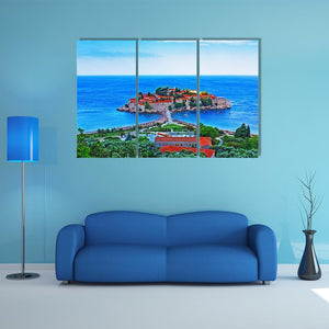 An aerial view of the island village of St. Stephen in Montenegro, with red-tiled roofs and a stone bridge connecting the island to the mainland. This realistic, sunlit landscape pairs blue sea and green trees for a serene, picturesque mood. Suited to modern or nature-inspired rooms.