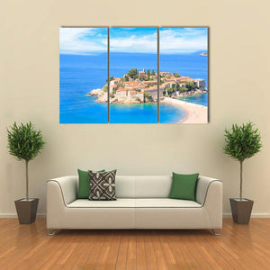 This photorealistic canvas shows an island village by the ocean — terracotta roofs, stone walls, a sandy beach and soft white clouds. The scene feels serene and idyllic, evoking a quiet summer vacation mood. It suits coastal or modern room decor, such as living rooms or bedrooms.