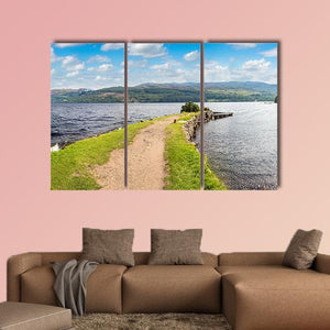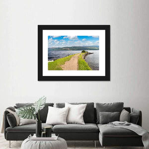 A photographic view of Loch Ness in Scotland featuring a grassy path, a stone wall, calm water and rolling hills under fluffy clouds. The green-and-blue palette and peaceful, natural mood make this landscape a quiet choice for modern living rooms and nature-inspired spaces.