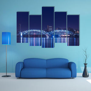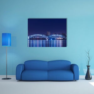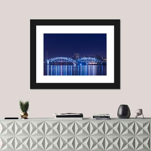 A symmetric cityscape showing an arched railway bridge over the Neva River, lit in blue and white with reflections on the water. The scene reads as serene and majestic, with a modern feel that works well in contemporary living rooms or offices.