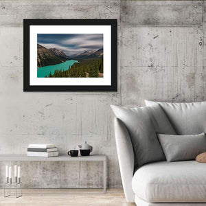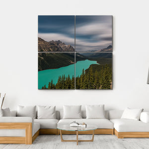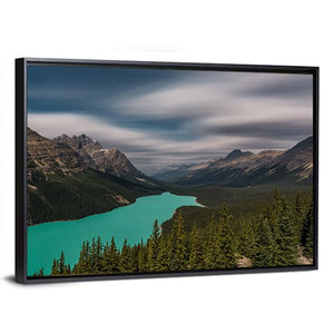 This canvas print captures a serene high-angle view of Peyto Lake, where turquoise waters meet majestic mountains and lush forests. With a blend of blues, greens, and grays, it evokes a vast and peaceful atmosphere, making it a perfect addition to your nature-inspired decor.