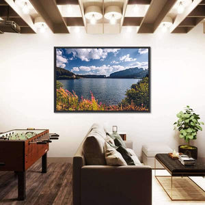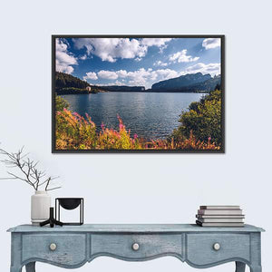 This canvas art captures the serene beauty of Bolboci Lake, framed by majestic mountains and lush trees. The tranquil scene features puffy white clouds above, with vibrant pink and yellow wildflowers in the foreground, creating a picturesque atmosphere.