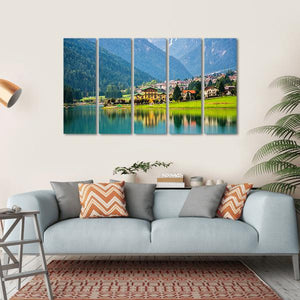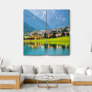 This canvas art captures a serene village by Lake Auronzo, surrounded by quaint buildings and lush, tree-covered mountains. Its peaceful palette of blues and greens creates an idyllic atmosphere, perfect for adding a touch of nature to your wall decor.