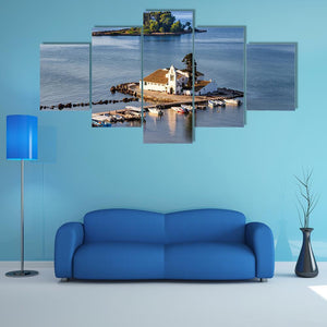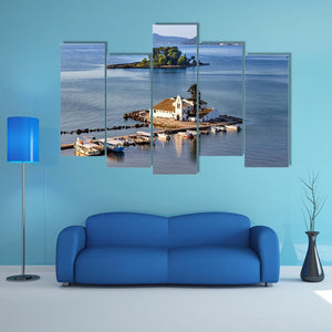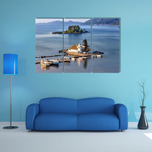 Vlacherna Monastery Church in Greece appears as a photorealistic landscape: a small white church on a tree-dotted islet with several boats moored on calm blue water. The scene reads serene and peaceful, with blues, greens and soft grays creating depth and a tranquil mood. This canvas wall art suits living rooms, entryways, or quiet corners in modern or coastal interiors.