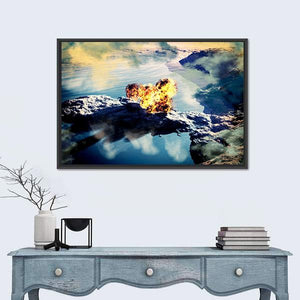 A volcanic eruption on an island centers on a heart-shaped rock formation and its reflection in calm water. Rendered in blue, yellow, orange, brown and white with an abstract, modern approach, the image feels surreal, dramatic and quietly serene. It suits modern or nature-inspired rooms as a contemplative focal piece.