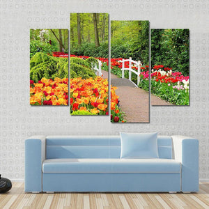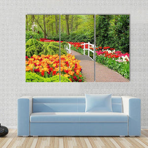 This canvas wall art features a vibrant landscape of a park pathway lined with tulips and trees, inviting serenity and beauty into your space. The depth of the scene, highlighted by a charming brick pathway and white railings, creates a picturesque view of spring in the Netherlands.