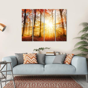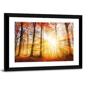 This canvas artwork captures a serene forest scene bathed in warm sunlight filtering through golden and orange autumn leaves. The inviting combination of colors and the depiction of fallen leaves create a tranquil atmosphere perfect for nature lovers.