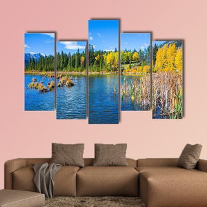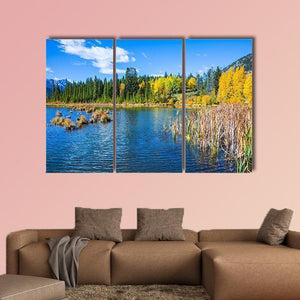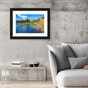 A realistic lakeside landscape showing calm water, reeds in the foreground, tall evergreens and bright yellow deciduous trees with distant mountains beneath a blue sky of white clouds. The peaceful, vibrant scene — with blues, greens, yellows and browns — creates a calm focal point for modern, nature-inspired living spaces.
