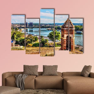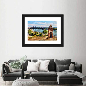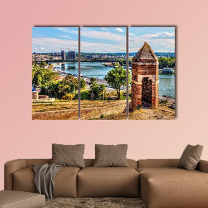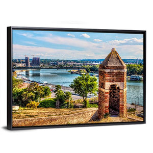 Watch Tower On The Kalemegdan Fortress shows a realistic landscape of a red-brick watchtower beside calm water with distant city buildings and treeline. Bathed in blues, browns and greens, the sunny, tranquil composition uses rule-of-thirds depth to create a quiet, historic feel that suits living rooms or studies with modern or classic decor.