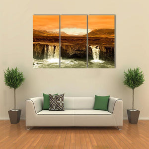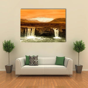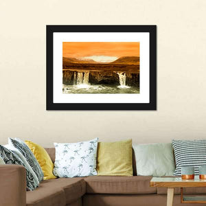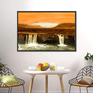 Godafoss Waterfall Canvas Wall Art shows a waterfall flowing past rocky cliffs and snow-capped mountains beneath an orange-tinged sky. The modern, dramatic image balances turbulent motion and calm, and suits living rooms or entryways with contemporary, nature-focused décor.