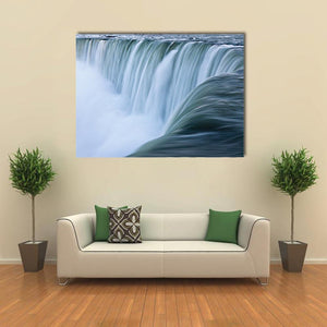 This captivating artwork features a majestic waterfall, capturing the power and beauty of nature. The close-up perspective highlights the motion of the water, with a serene blend of blue, white, green, and gray tones that evoke a calming atmosphere.