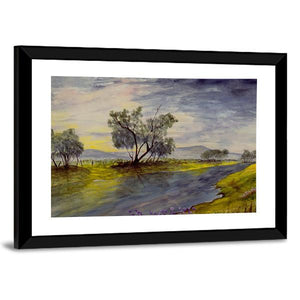 This watercolor painting captures a serene stream flowing through a landscape of trees and mountains. With purple wildflowers in the foreground and reflections glimmering on the water, it invites a calm and contemplative atmosphere, making it a lovely addition to any nature-inspired decor.