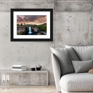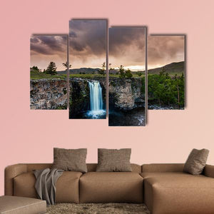 An atmospheric nature photograph of a waterfall in Mongolia, where the falls move beneath a stormy sunset sky. Cliffs and trees sit in layered depth, with blues, greens, browns and greys arranged by rule-of-thirds for a dramatic yet serene presence that works well in modern home interiors and room decor.
