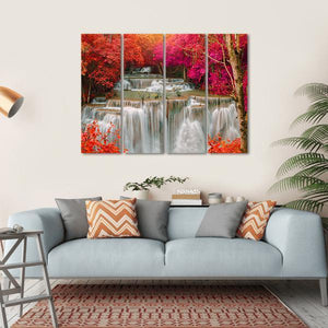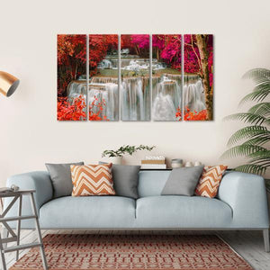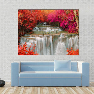 This canvas wall art features a serene landscape of a multi-tiered waterfall cascading through a vibrant jungle, surrounded by rich red and pink foliage. The sunlight filtering through the trees enhances the natural beauty, making it a stunning addition to any nature-themed decor.
