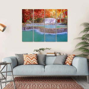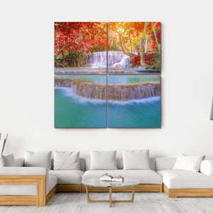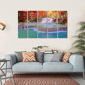 Bring the tranquility of nature indoors with this captivating artwork featuring a vibrant multi-tiered waterfall nestled among lush green trees. Sunlight filters through the forest, enhancing the serene atmosphere, making it an ideal addition to any space seeking a touch of natural beauty.