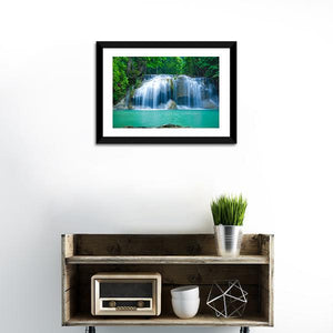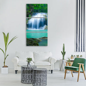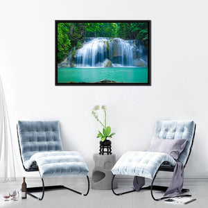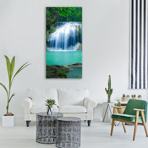 This canvas art features a serene waterfall surrounded by lush tropical foliage and rocks. The vibrant greens and calming blues capture the refreshing beauty of nature, making it an ideal addition to any room.