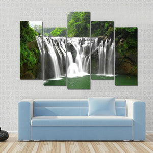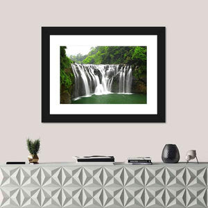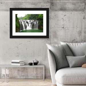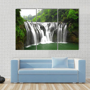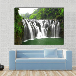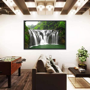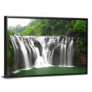 This canvas wall art captures a serene waterfall amidst lush vegetation and dark rocks in Taiwan. The realistic depiction conveys a natural and powerful energy, making it a beautiful addition to any decor.