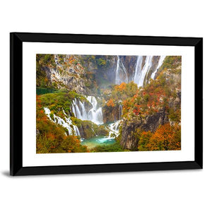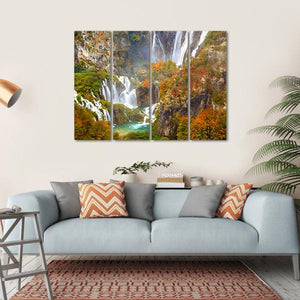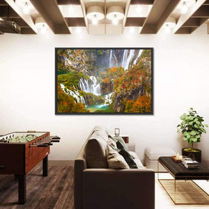 Experience the serene beauty of cascading waterfalls in Croatia’s Plitvice National Park. This vibrant canvas captures the lush green trees and rich autumn foliage, bringing a natural essence to your space.