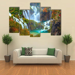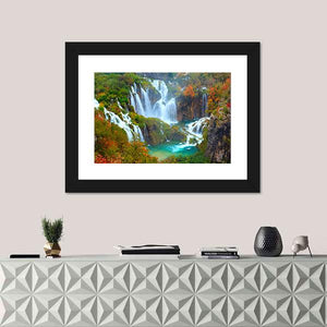 Waterfalls of Plitvice National Park captures cascading falls, turquoise pools and colorful autumn trees in a layered, dynamic scene. The image feels vibrant and refreshing while remaining calm and serene. Suited to modern or nature-inspired home spaces like living rooms and entryways.