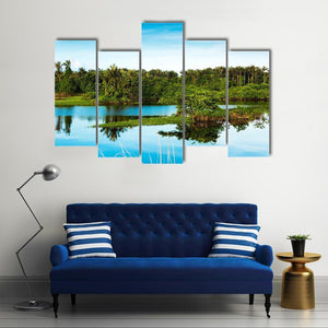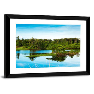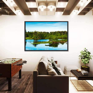 This canvas features a tranquil landscape, showcasing a serene lake surrounded by tropical trees. The reflection of the clear blue sky and wispy clouds on still water evokes a calm and natural atmosphere.