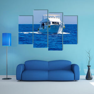 A white motor yacht cuts through blue ocean waters, shown in a mid-shot, angled view that captures dynamic motion and waking water. Yellow accents against a blue-and-white palette give the scene an energetic, bright, yet serene mood. It works well in modern living rooms and coastal-inspired spaces.
