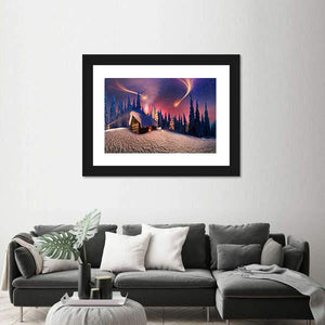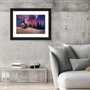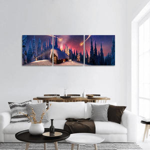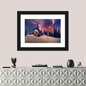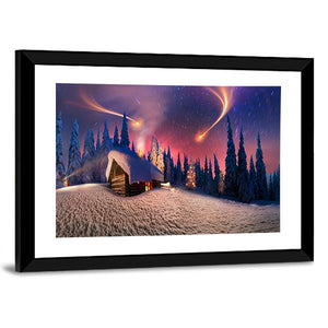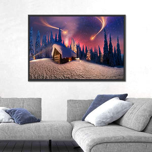 A panoramic digital canvas of a wild alpine scene in the Carpathians, showing a snowy winter forest and a small cabin beneath streaking meteors. Cool blues, pinks and warm cabin light give the scene a mystical, dramatic and serene mood. Suits modern or rustic rooms like living rooms and bedrooms as a nature-focused wall piece.