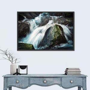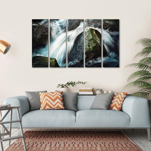 This canvas features a serene waterfall cascading over dark, textured rocks, embodying the powerful flow of nature. The close-up perspective captures the dynamic movement of water, blending shades of blue, green, and gray for a tranquil atmosphere.