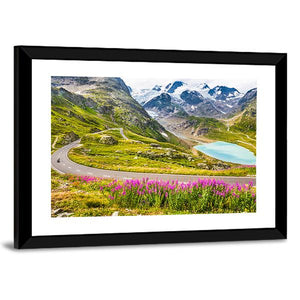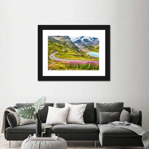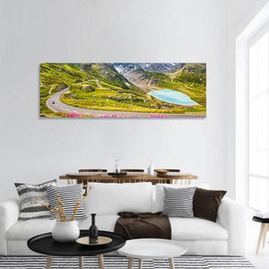 A panoramic canvas of a winding mountain road in the Italian Alps, showing an alpine lake, distant glacier, flowers lining the roadside and a motorcycle on the pass. Rendered in greens, blues, grays, white and soft pink, the realistic scenic view feels serene, adventurous and majestic. Suited to modern living rooms, hallways or offices as wall decor.
