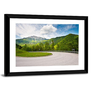 A photorealistic landscape showing a winding paved road framed by trees and a snow-capped mountain peak in the Italian Alps. The green, blue, gray and white palette creates a serene, majestic mood that suits modern room decor and works well in living rooms, hallways, or home offices.