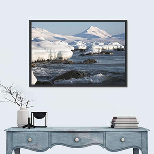 A photorealistic panoramic view of an icy Arctic coastline, showing waves crashing over rocks and ice formations. Cool blues, whites, grays, and browns create a serene, cold, peaceful mood that suits modern or minimalist room decor.