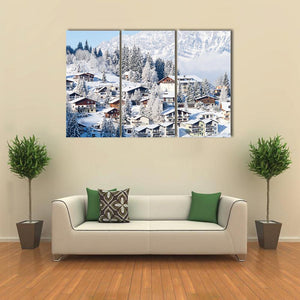 This canvas print captures a serene winter scene of a snowy village nestled among majestic mountains and evergreen trees. The realistic details, including houses with snow-covered roofs and towering snow-capped peaks, evoke a peaceful, wintry atmosphere, making it a perfect addition to your wall decor.