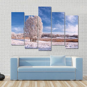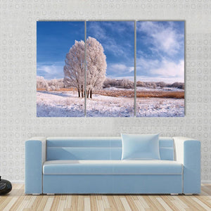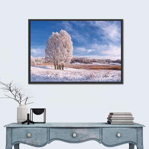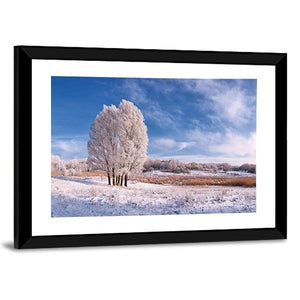 This artwork captures a serene winter scene featuring a frozen tree amidst a snowy field under a peaceful blue sky. The photorealistic style invites a sense of calm, making it a beautiful addition to any space.