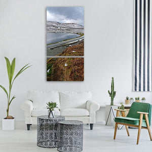 Snow-capped mountains, a winding road, and a calm lake sit under an overcast sky in this photorealistic winter landscape. The serene, natural scene works well in modern or nature-inspired rooms as relaxed wall decor.