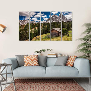This canvas art captures a serene landscape featuring a rustic wooden cabin nestled among snow-capped mountains and a lush pine forest. The tranquil palette of green, brown, and blue evokes a peaceful atmosphere, making it a beautiful addition to nature-inspired decor.