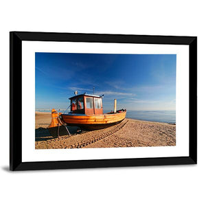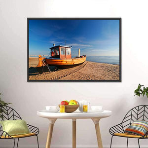 Photographic canvas showing a boat resting on a sandy beach beneath a calm, sunny sky. The wide-angle, fisheye perspective captures tire tracks on the sand and the boat’s small cabin, with soft blues, warm tans, and brown tones for a peaceful seaside mood. Works well in modern living rooms or beach house decor.