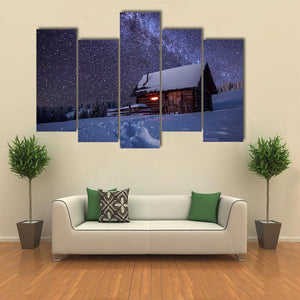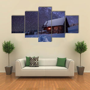 This photorealistic canvas shows a wooden house with a glowing window tucked into a snowy forest beneath a clear Milky Way night sky. Dark blues, whites and warm browns create a serene, majestic, and isolated mood that pairs nicely with rustic or modern room decor.
