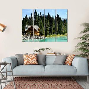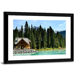 This canvas features a rustic cabin set against the serene backdrop of Emerald Lake, surrounded by coniferous trees and distant mountains. The peaceful palette of greens, blues, and browns evokes a natural, tranquil atmosphere, making it a lovely addition to your home decor.