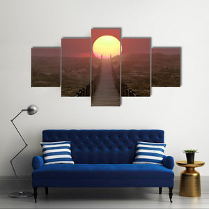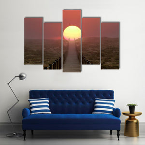 Wooden Walkway Over A Dune shows a centered wooden boardwalk leading across warm dunes toward a sun partly obscured by mist, with railings and low vegetation guiding the eye. Rendered in rich reds, oranges, browns and greens, the naturalistic scene feels peaceful, serene, and warm. It suits coastal, nature-inspired, or modern rooms as a calm focal piece.
