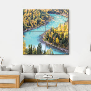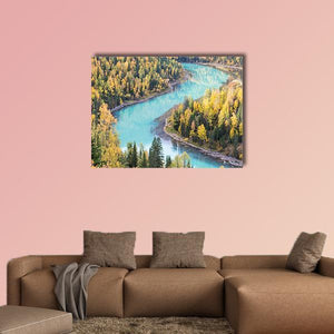 This canvas wall art captures the serene beauty of Xinjiang's Kanas region in autumn. Featuring a vibrant turquoise river winding through a dense forest and majestic mountains, it invites a natural, calming presence into your space.