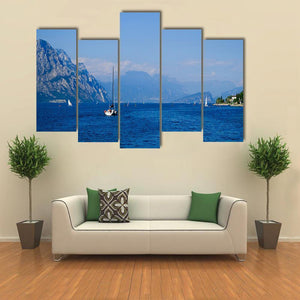 A realistic landscape canvas showing a tall-mast yacht on a calm mountain lake beneath a clear blue sky, with a distant mountain range. The composition uses depth and rule-of-thirds to create a serene, bright atmosphere. The blue-green palette and peaceful mood suit modern or nature-themed home interiors.