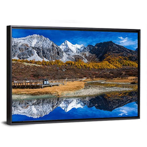 This canvas art beautifully captures the Yading National Reserve in China, showcasing snowy mountains and a serene lake reflection. The vibrant blue sky and autumn foliage create a peaceful and majestic scene, perfect for enhancing any nature-inspired décor.