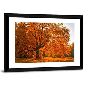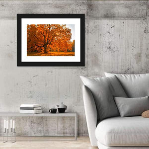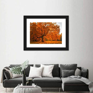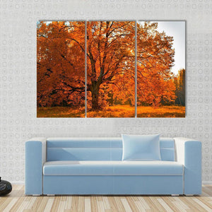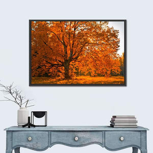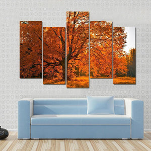 This canvas art captures the beauty of autumn with a centered tree surrounded by vibrant foliage. The warm palette of oranges, yellows, and browns evokes a cozy feeling, perfect for bringing nature indoors.