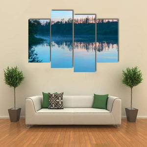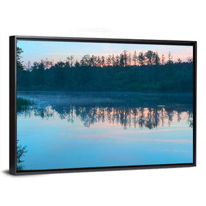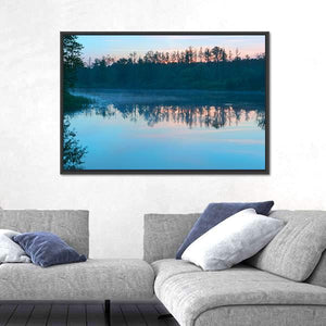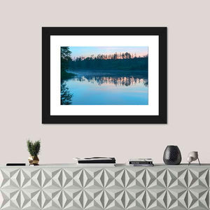 Yellow Sunset on the Shore of the Baltic Sea presents a peaceful coastal landscape with trees, mist on the water and the sunset sky reflected across the calm surface. Soft blues, greens, pinks and warm yellow-orange tones create a serene, tranquil mood that works well in modern or nature-inspired rooms.